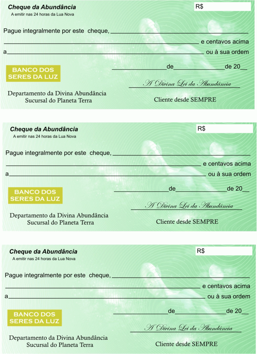 Pedimos que utilizem o cheque somente para questões realmente necessárias, pois assim ele mantém a simbologia e a energia do “Sagrado”, de nosso contato com a nossa Abundância, com o devido respeito que o assunto merece.