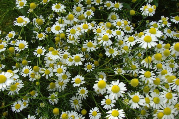 A camomila facilita a menstruação, combate distúrbios digestivos, úlceras da boca e garganta, gota e vermes intestinais.